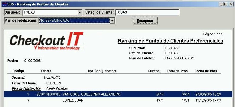 Los filtros disponibles son la sucursal, categoría de cliente y plan de fidelización. Al igual que en todos los informes del sistema, luego de establecer los filtros se presiona el botón "Recuperar" para obtener la información.