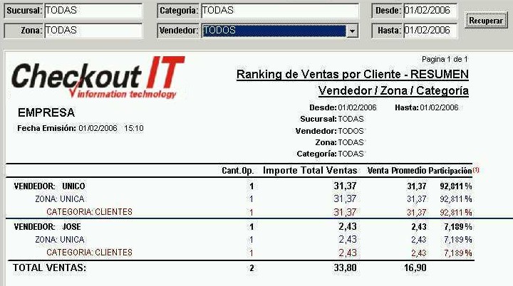 Los filtros disponibles son la sucursal, la categoría, la zona, el vendedor, la fecha desde y la fecha hasta. Al igual que en todos los informes del sistema, luego de establecer los filtros se presiona el botón "Recuperar" para obtener la información.