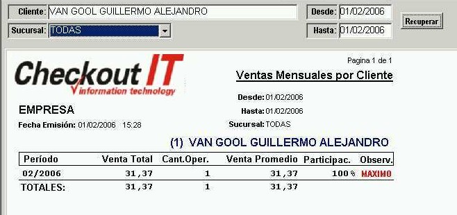 Los filtros disponibles son el cliente, la sucursal, la fecha desde y la fecha hasta. Al igual que en todos los informes del sistema, luego de establecer los filtros se presiona el botón "Recuperar" para obtener la información.