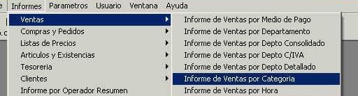 Se accede desde el menú "Informes - Ventas - Informe de Ventas por Categoría" de la barra de menú. El listado muestra los totales de las ventas agrupados por departamento y dentro de cada uno de ellos por categoría.