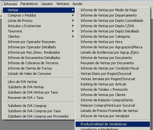 Se accede desde el menú "Informes - Ventas - Productividad de Vendedores" de la barra de menú. El listado muestra los totales de las ventas realizadas por cada vendedor en las diferentes horas de trabajo.