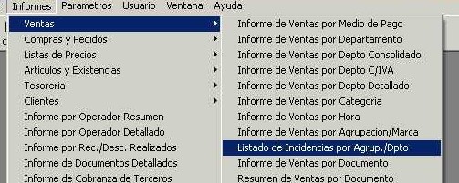 Se accede desde el menú "Informes - Ventas - Listado de Incidencias por Agrup./Dpto" de la barra de menú. El listado enumera todos los artículos agrupados por "Agrupación" y dentro de cada agrupación los divide por "Departamentos". Para cada uno de los artículos informa datos relacionados a las ventas realizadas y el valor de la incidencia.