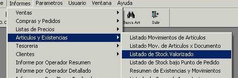 Se accede desde el menú "Informes - Artículos & Existencias - Listado de Stock Valorizado" de la barra de menú.