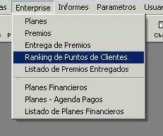 Se accede desde el menú "Enterprise - Ranking de Puntos de Clientes" de la barra de menú. El listado enumera los clientes y muestra los puntos que tienen acumulados cada uno de ellos.