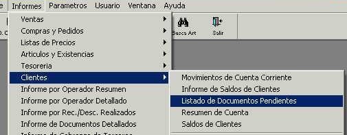 Se accede desde el menú "Informes - Clientes - Listado de Documentos Pendientes" de la barra de menú. El listado muestra aquellos comprobantes impagos por parte de cada uno de los clientes, esta información esta agrupada por vendedor, zona y cliente.
