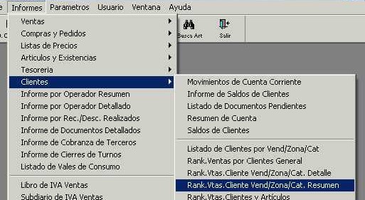 Se accede desde el menú "Informes - Clientes - Rank.Vtas.Cliente Vend/Zona/Cat. Resumen" de la barra de menú. El listado muestra un resumen de las ventas de los clientes agrupadas por vendedor y zona.
