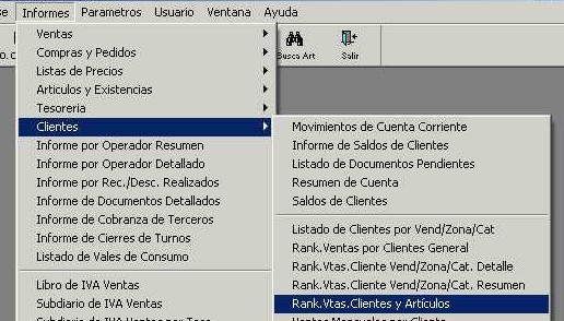 Se accede desde el menú "Informes - Clientes - Rank.Vtas.Clientes y Artículos" de la barra de menú. El listado muestra para un cliente determinado, los artículos vendidos e información relacionada a sus ventas.