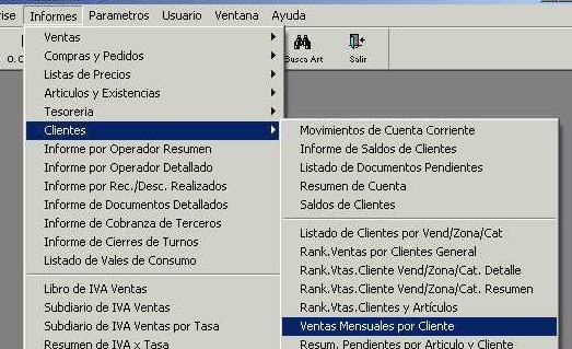 Se accede desde el menú "Informes - Clientes - Ventas Mensuales por Cliente" de la barra de menú.
