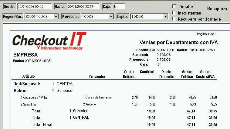 Los filtros disponibles son la fecha desde, la fecha hasta, la caja (0= TODAS), región / sucursal, proveedor y departamento. Luego de establecerlos, debemos presionar el botón Recuperar para obtener la información. Además, existen dos opciones importantes: una es "Recuperar por Jornada" que la explicamos más arriba y la opción "Detalle". Si marcamos esta última, se verán los artículos dentro de los departamentos, de lo contrario se mostrara solo un total por departamento.