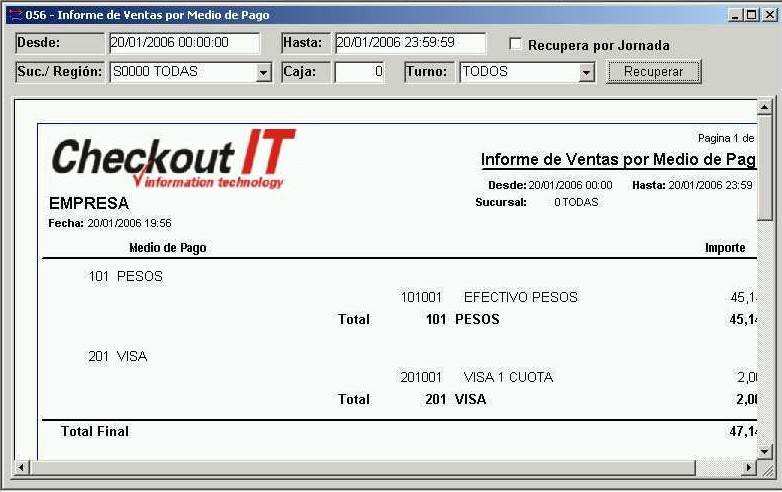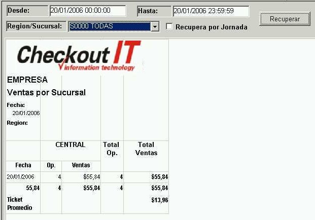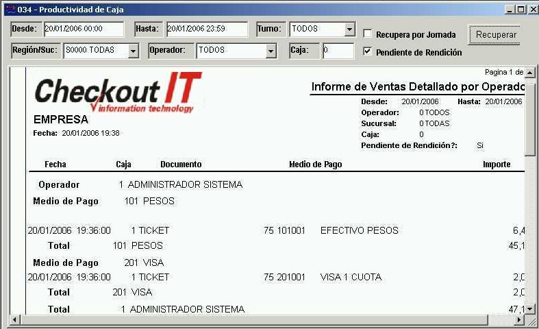 Los filtros disponibles son fecha desde, fecha hasta, turno, región / sucursal,operador y caja (0 = TODAS). Luego de establecer los filtros recuperar la información presionando el botón "Recuperar".
