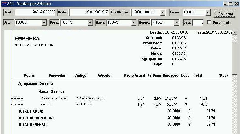 Se accede desde el menú "Informes - Ventas - Ranking de Ventas por Artículo" de la barra de menú. El informe muestra todos los artículos vendidos agrupados por "Agrupación" y "Marca", detallando para cada uno de ellos datos relacionados con las ventas.