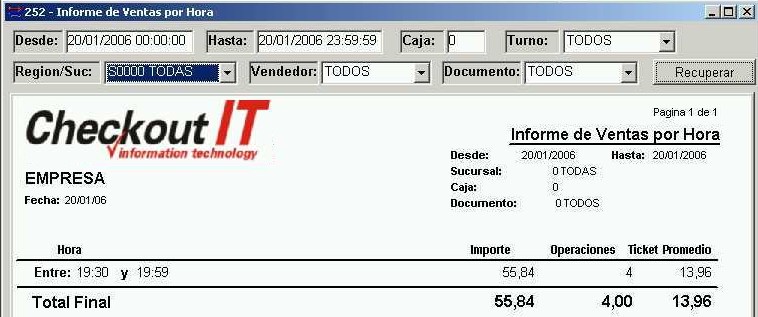 Los filtros disponibles son fecha desde, fecha hasta, caja (0 = TODOS), turno, región / sucursal, vendedor y documento (tipo de documento). Luego de establecer los filtros, debemos presionar el botón Recuperar para obtener la información.
