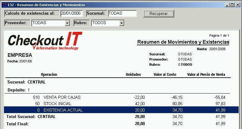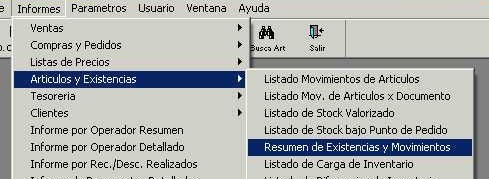 Se accede desde el menú "Informes - Resumen de Existencias y Movimientos" de la barra de menú. Este informe nos muestra, por cada tipo de operación relacionada a movimientos de stock, los siguientes datos: la cantidad de unidades, la suma de los valores al costo y la suma de los valores al precio.