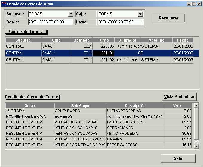 Los filtros disponibles son la sucursal, la caja, la fecha desde y la fecha hasta. Al igual que en todos los informes del sistema, luego de establecer los filtros se presiona el botón Recuperar para obtener la información. La pantalla se divide en dos partes: la parte de arriba se llama "Cierres de Turno" y contiene todos los cierres de turno realizados tomando en cuenta los filtros establecidos, al seleccionar cualquiera de ellos se podrá visualizar en la parte de abajo llamada "Detalle del Cierre de Turno" el detalle del cierre de turno seleccionado.