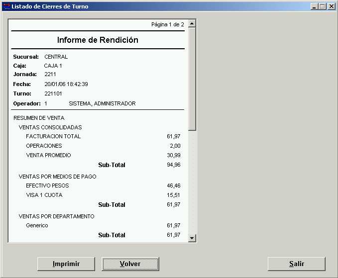Presionando sobre el botón "Vista Preliminar" podemos ver el detalle del cierre de turno en formato de impresión. Además de visualizarlo , existe la posibilidad de imprimirlo presionando el botón "Imprimir".