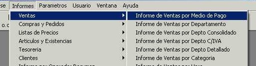 Se accede desde el menú "Informes - Ventas - Informe de Ventas por Medio de Pago" de la barra de menú. Este listado muestra el total de las ventas (C/IVA) por medio de pago.