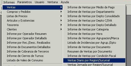 Se accede desde el menú "Informes - Ventas - Ventas Diario por Región / Sucursal" de la barra de menú. El listado muestra el total de las ventas, cantidad de operaciones y un valor denominado "Ticket promedio". Los totales mostrados corresponden a los filtros establecidos, y estos totales se calculan a partir de los totales de cada venta realizada.