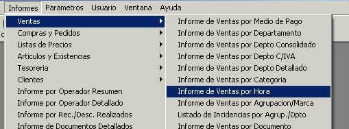 Se accede desde el menú "Informes - Ventas - Ventas por Hora" de la barra de menú. Este informe muestra totales de las ventas, cantidad de operaciones y promedio de las mismas, esto lo agrupa por intervalo de tiempo. Es útil para saber en que horarios estamos vendiendo más que en otros.