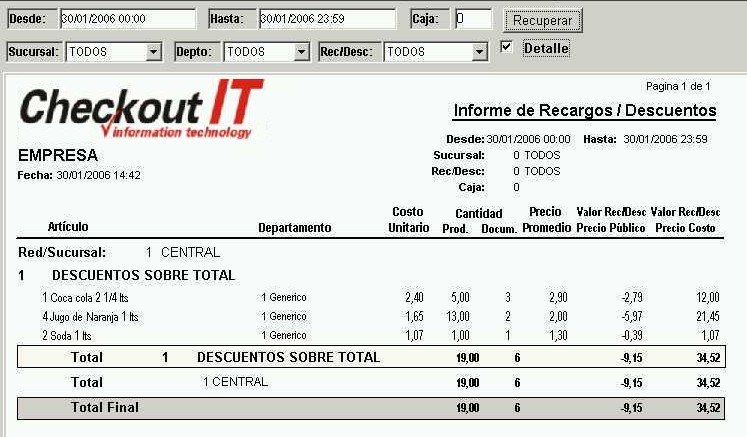 Los filtros disponibles son la fecha desde, la fecha hasta, caja ( 0 = TODAS ), sucursal, departamento y el tipo de recargo o descuento. Al igual que en todos los informes del sistema, luego de establecer los filtros se presiona el botón "Recuperar" para obtener la información. Además, está presente la opción de ver el detalle de los artículos sobre los cuales se aplicaron los recargos o descuentos. Para esto se debe marcar la opción "Detalle" antes de presionar el botón "Recuperar".