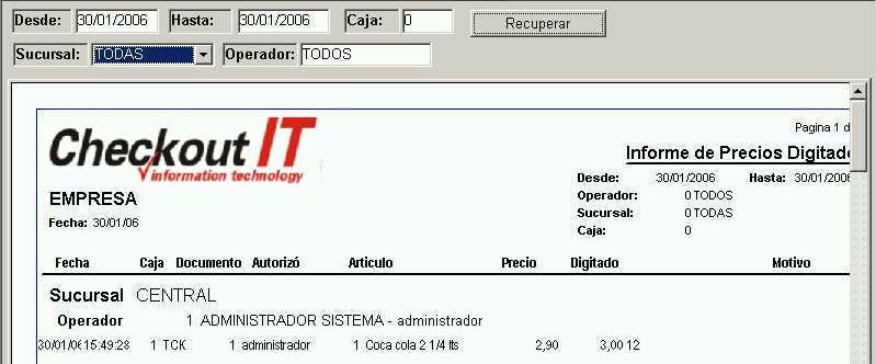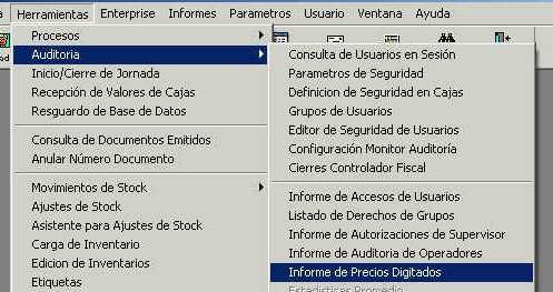 Se accede desde el menú "Herramientas - Auditoria - Informe de Precios Digitados" de la barra de menú. El listado muestra información sobre los precios digitados que ingresaron los operadores en los puntos de venta.