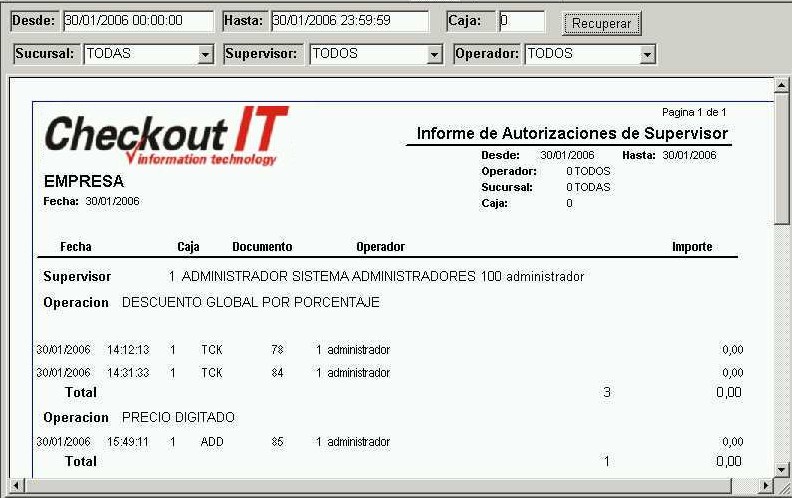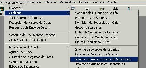 Se accede desde el menú "Herramientas - Auditoria - Informe de Autorizaciones de Supervisor" de la barra de menú. El listado muestra, agrupadas por tipo de operación, todos las autorizaciones realizadas por aquellos operadores que cumplen el rol de supervisor.