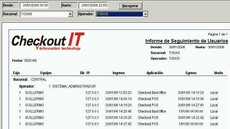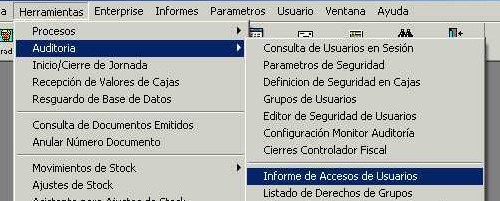 Se accede desde el menú "Herramientas - Auditoria - Informe de Accesos de Usuarios" de la barra de menú. El informe muestra, agrupados por operador, todos los accesos al sistema realizados.