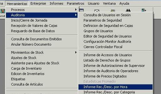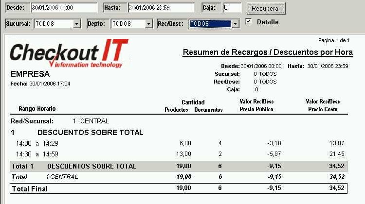 Se accede desde el menú "Herramientas - Auditoria - Informe Rec./Desc. por Hora" de la barra de menú. El listado muestra los totales de los descuentos y recargos en los diferentes rangos de horarios de 30 minutos cada uno. Además, se agrupa la información por tipo de recargo/descuento.