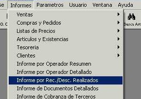 Se accede desde el menú "Informes - Informe de Rec/Desc Realizados" de la barra de menú. El listado muestra todos los recargos y descuentos realizados, agrupándolos por tipo de recargo o descuento. Para cada uno de estos grupos se muestran los totales.
