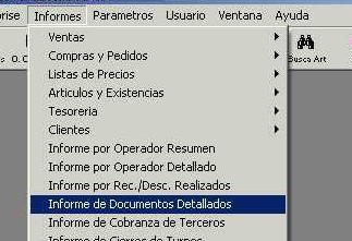 Se accede desde el menú "Informes - Informe de Documentos Detallados" de la barra de menú. El listado muestra todos los documentos emitidos con el detalle de los artículos correspondientes a cada uno de ellos.