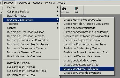 Se accede desde el menú "Informes - Artículos & Existencias - Listado de Ajustes Realizados" de la barra de menú. El listado contiene la información de los ajustes de stock realizados en el sistema, y muestra la información relacionada a cada uno de ellos.