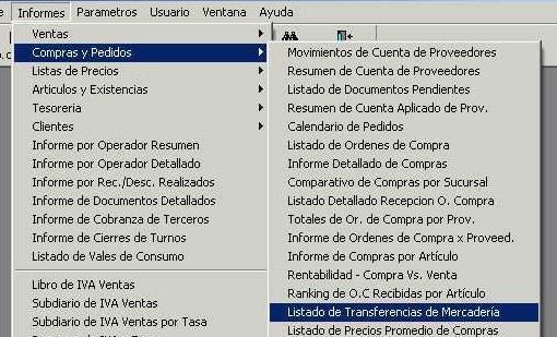 Se accede desde el menú "Informes - Compras & Pedidos - Listado de Transferencias de Mercadería" de la barra de menú. El listado muestra todas las transferencias de mercadería que se realizaron entre las sucursales de la empresa.