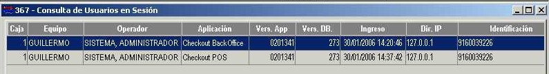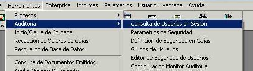 Se accede desde el menú "Herramientas - Auditoria - Consulta de Usuarios en Sesión" de la barra de menú. El listado muestra todos los operadores que hayan iniciado y aún estén en sesión.