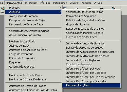 Se accede desde el menú "Herramientas - Auditoria - Resumen Rec./Desc." de la barra de menú. El listado muestra un resumen de todos los recargos y descuentos realizados, agrupando esta información por tipo de recargo/descuento.