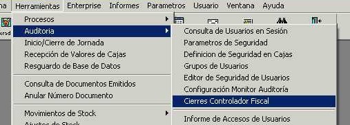 Se accede desde el menú "Herramientas - Auditoria - Cierres Controlador Fiscal" de la barra de menú. El listado enumera todos los cierres fiscales realizados hasta el momento.